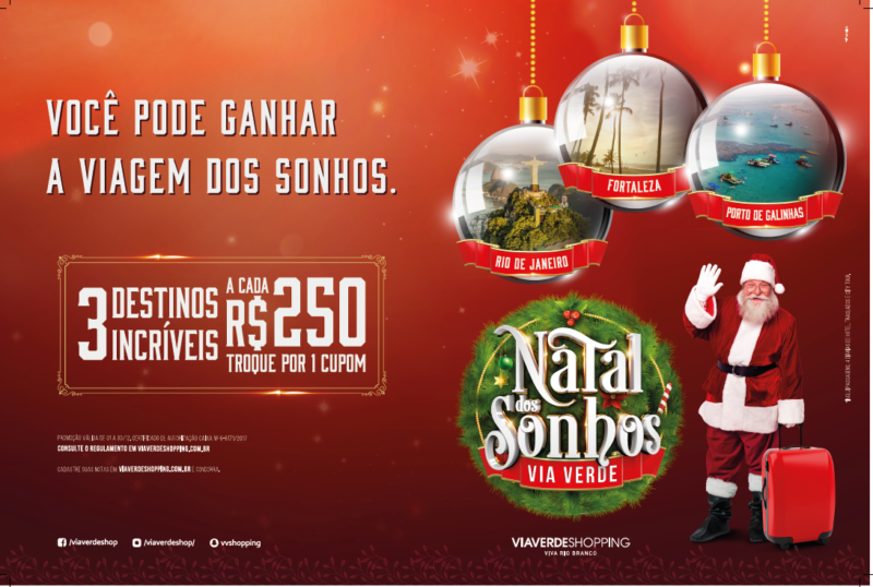 Já pensou em ganhar uma viagem dos sonhos com direito a acompanhante em um lugar paradisíaco? Na promoção de Natal do Via Verde Shopping, que começa nesta sexta-feira (1º de dezembro), você pode! A cada R$ 250 em notas fiscais, das lojas participantes, você ganha um cupom para concorrer a uma das três viagens que serão sorteadas. Os destinos incríveis são: Fortaleza, Porto de Galinhas e Rio de Janeiro.