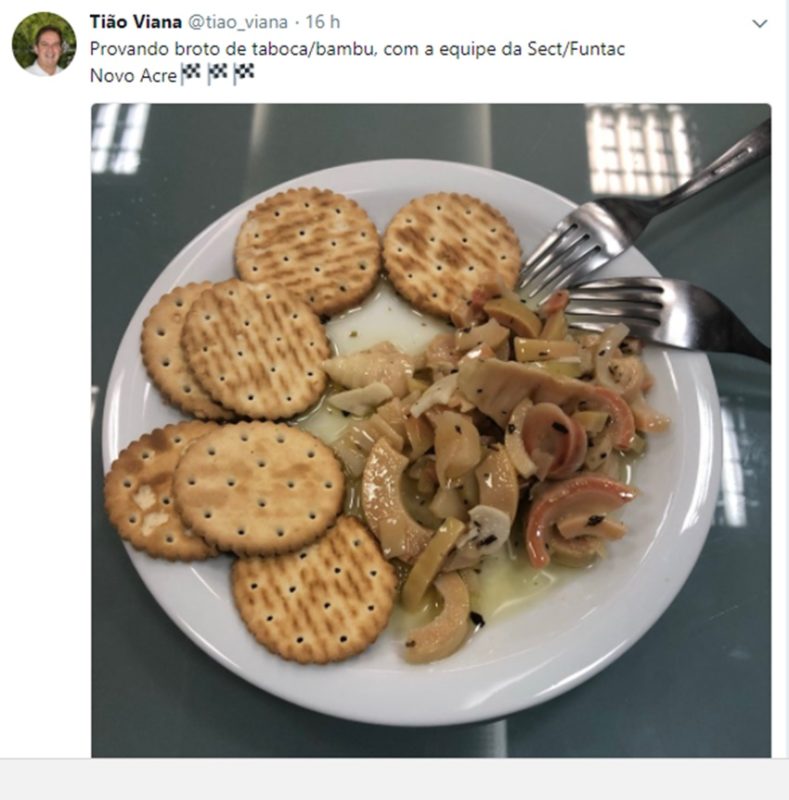 Cercado de críticas e reclamações que partem dos trabalhadores que atendem o Governo, Tião Viana segue utilizando seu tempo em suas postagens rotineiras nas redes sociais que têm se divido entre apoiar Lula, ex-presidente petista condenado em segunda instância no TRF-4, e mostrar cenas de sua agenda no dia a dia. Na tarde de ontem (30), por exemplo, o governador compartilhou com seus seguidores que estaria degustando um delicioso broto de taboca/bambu servido com bolachas.
