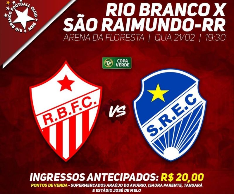 Estão à venda, a partir desta segunda-feira (19) os ingressos para o jogo de volta entre Rio Branco-AC e São Raimundo-RR, válido pela primeira fase da Copa Verde. O duelo será disputado nesta quarta-feira (21), na Arena da Floresta, na capital acreana. A diretoria do clube acreano disponibilizou 1 mil bilhetes, com promoção. Os torcedores pagam R$20 até às 15h da quarta.