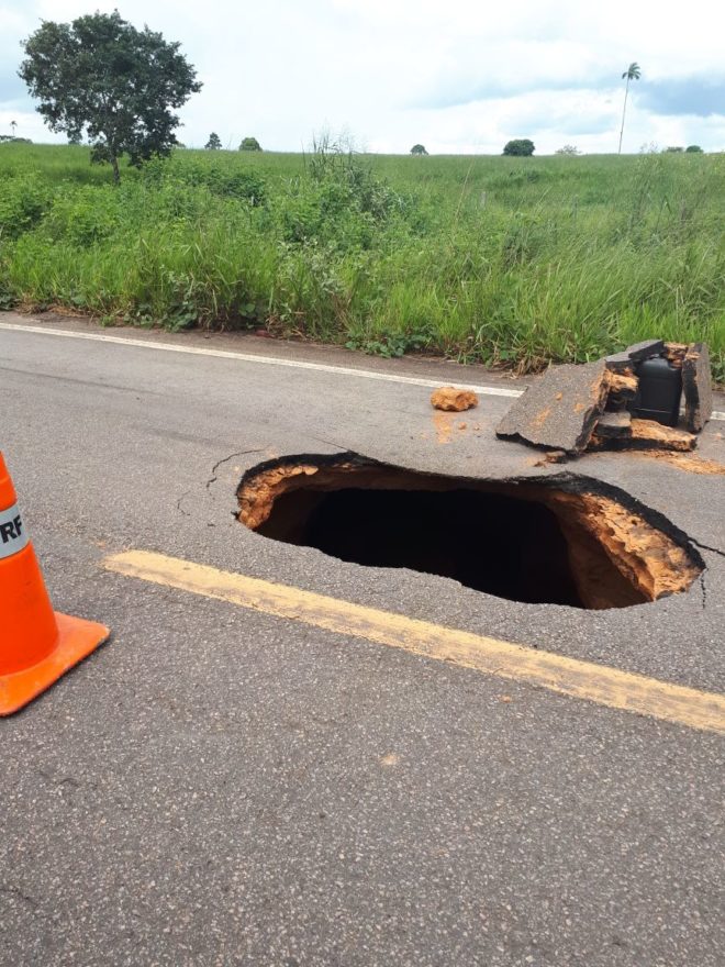 Cratera pode ocasionar vários acidentes na estrada da BR. Foto: Reprodução