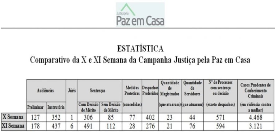 No Acre, por exemplo, foram realizados mutirão de audiências e julgamentos de feminicídio ou tentativa de homicídio contra mulher, além de palestras em escolas e igrejas sobre a Lei Maria da Penha. Foram 1.347 processos trabalhados em todo o Estado.