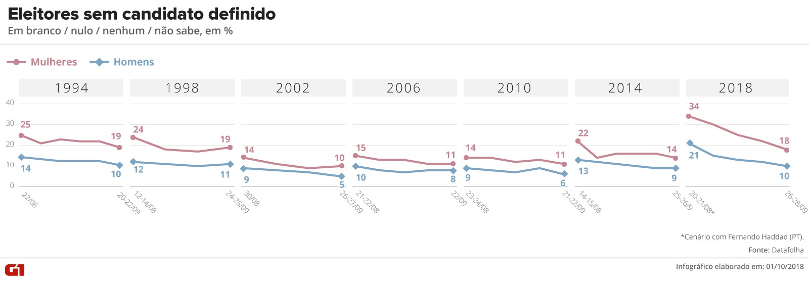 A parcela de eleitoras que, a cerca de 10 dias da eleição, não têm um candidato definido para a Presidência é o maior em 20 anos, segundo levantamento do G1 com pesquisas do Instituto Datafolha.