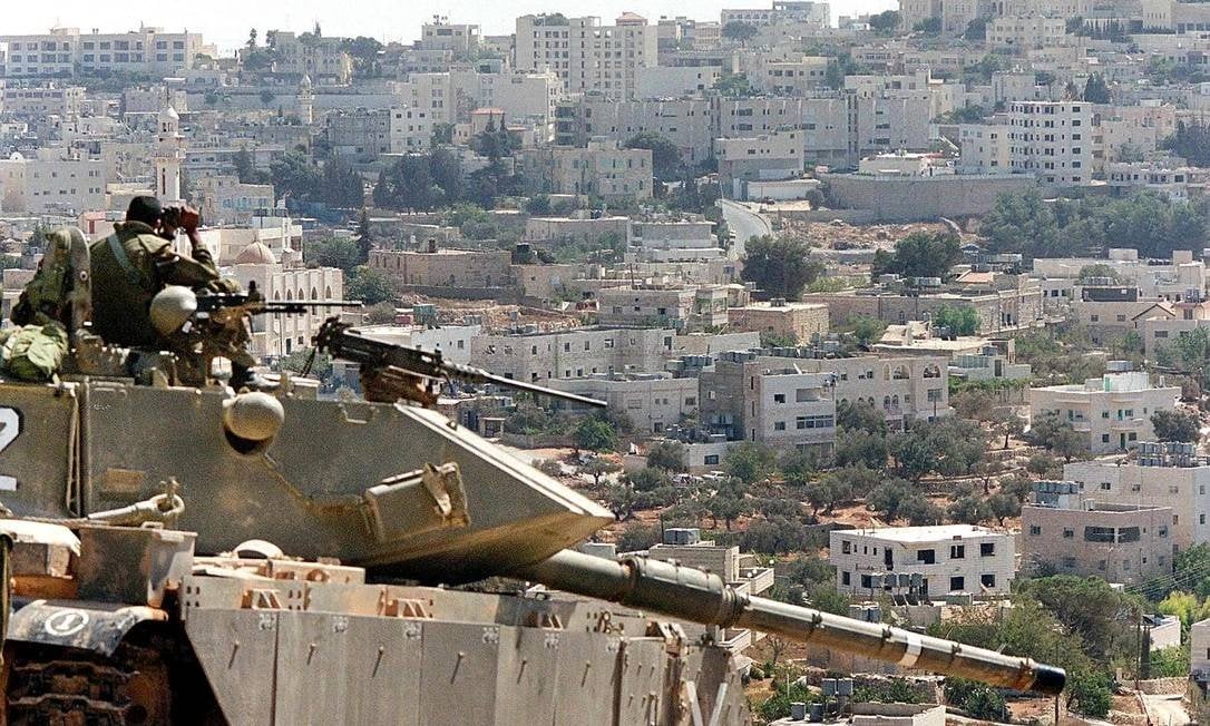 Soldados israelenses se posicionam com seus tanques de guerra. Ao fundo, a cidade de Belém, na Palestina Foto: Patrick Baz / AFP