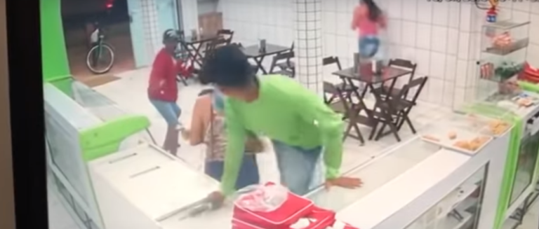 As câmeras de segurança de uma panificadora em Tarauacá, no interior do Acre, mostram o exato momento em que dois assaltantes entram no estabelecimento e já chegam atirando.