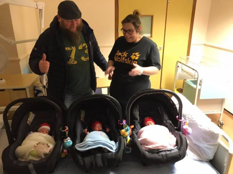 Beata Bienias ao lado de seus três bebês e o marido/Foto: Facebook