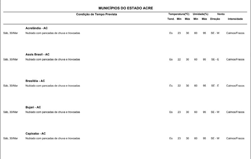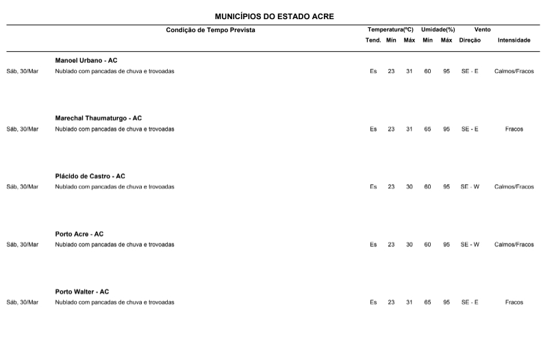 Neste sábado (3), a previsão para todas as regiões acreanas é de predomínio de sol entre muitas nuvens, deixando o tempo nublado e no período da tarde e noite ocorrem pancadas de chuva acompanhadas de trovoadas.