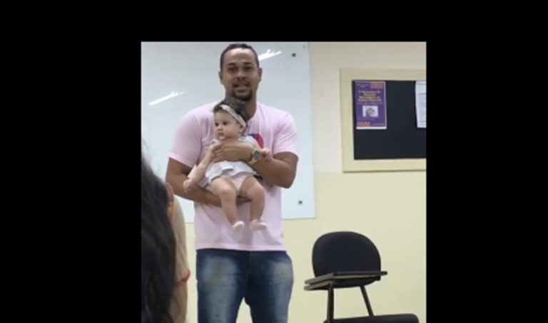 Thayane disse que não tinha com quem deixar a filha Manu em casa e, por esse motivo, levou a criança para a sala de aula. No momento em que a bebê começou a chorar, se viu envergonhada e, ao tentar sair, ficou impressionada com a atitude do docente.
