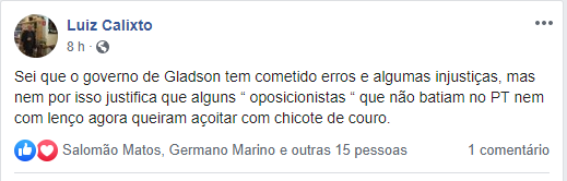 O servidor público afirma que o governo Gladson tem cometido erros e algumas injustiças. “Nem por isso justifica que alguns “oposicionistas“ que não batiam no PT nem com lenço agora querem açoitar com chicote de couro”, explicou Calixto.