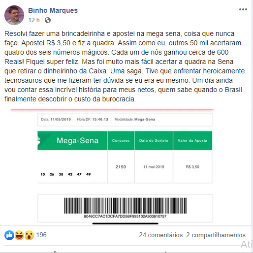 Em uma publicação em seu facebook ele comemorou a sorte, mas reclamou mesmo foi do trabalhão que teve para receber seu dinheiro. “Foi muito mais fácil acertar a quadra na Sena que retirar o dinheirinho da Caixa. Uma saga. Tive que enfrentar heroicamente tecnosauros que me fizeram ter dúvida se eu era eu mesmo. Um dia ainda vou contar essa incrível história para meus netos, quem sabe quando o Brasil finalmente descobrir o custo da burocracia”, declarou.