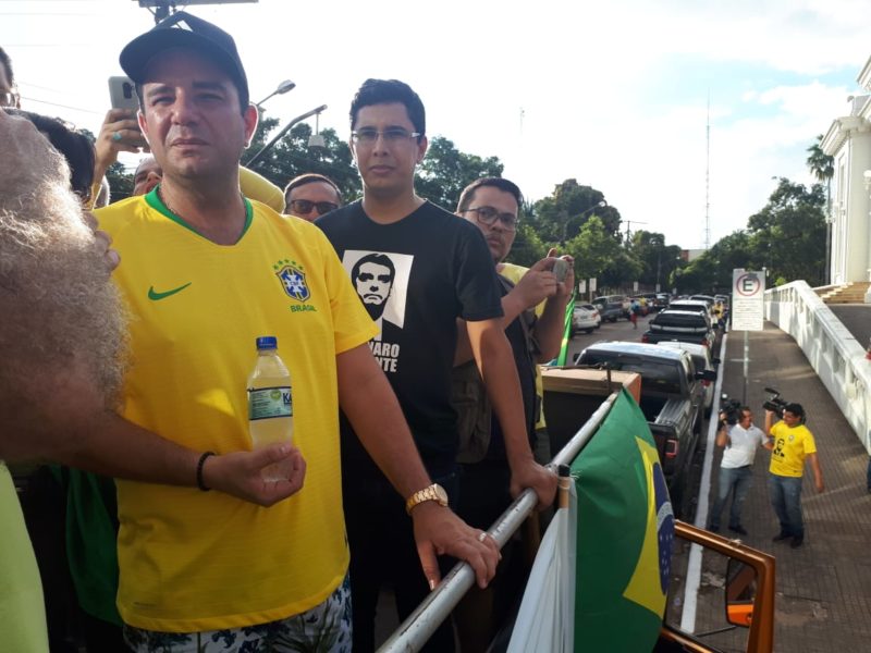 Vestido com a camisa da Seleção Brasileira, o governador Gladson Cameli (Progressistas) compareceu na tarde deste domingo (26) ao ato pró-Bolsonaro em frente do Palácio Rio Branco. Ao chegar, Cameli acenou e tirou fotos com militantes.