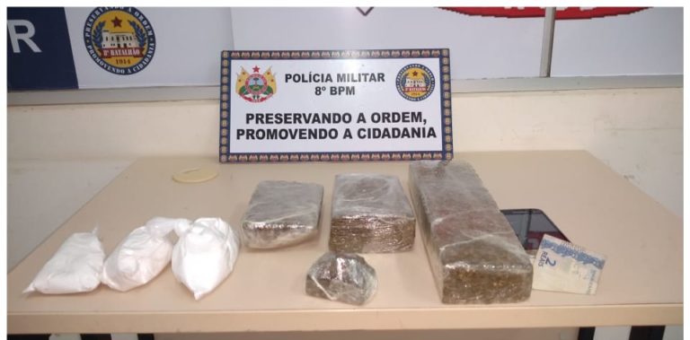 Foi encontrado na bolsa que dele quatro tabletes de maconha e três pacotes de cocaína, pesando, ao todo, 1,778 kg.