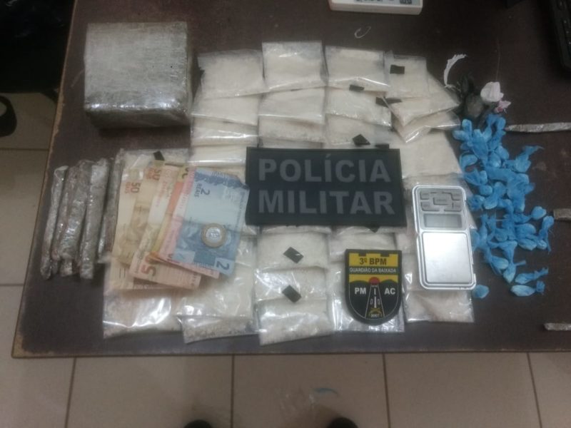 Policiais do 3° Batalhão de Polícia Militar apreenderam na noite deste sábado, 25 de maio, mais de 1 kg de entorpecentes e 183 reais. O fato aconteceu durante patrulhamento preventivo na Rua Cruzeiro do Sul, bairro Volta Seca, em Rio Branco.