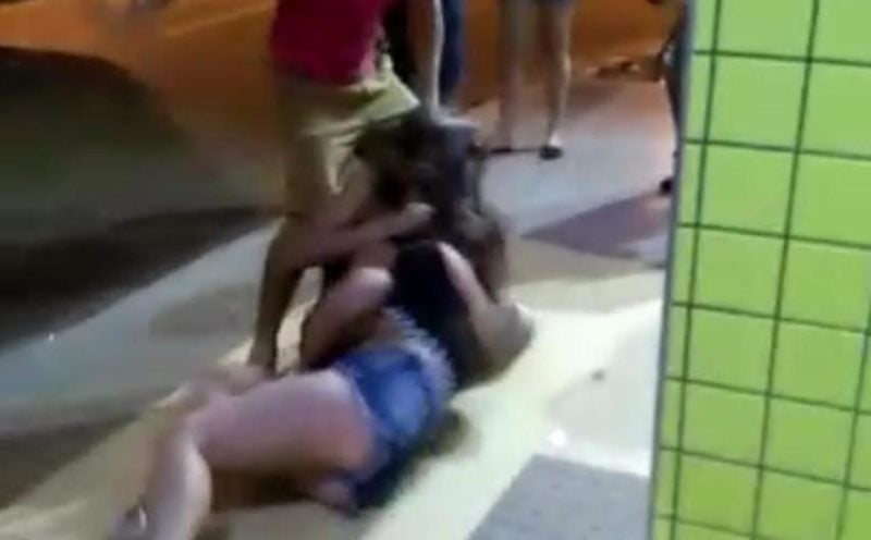 Pelo menos quatro mulheres e um homem se esmurram violentamente, enquanto pessoas assistem e filmam a confusão.