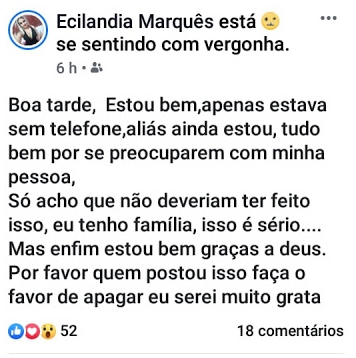 Não passou de um susto o desaparecimento da agente de polícia Ecilândia Marquês, da delegacia geral de Polícia de Sena Madureira. Ela estava em casa e o seu desaparecimento foi comunicado por colegas, inclusive ao Sindicato dos Policiais Civis e à diretoria de Polícia Judiciária do Estado, porque sua residência estava fechada e ela não atendia a telefonemas.