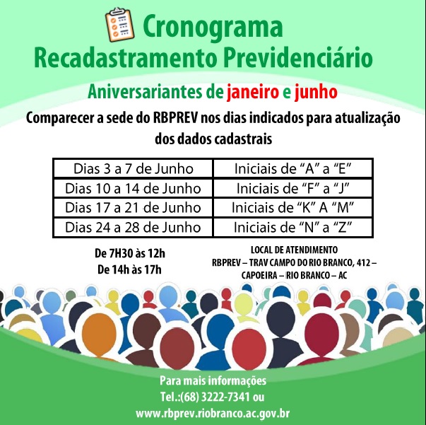 A Prefeitura de Rio Branco, por meio do Instituto de Previdência do Município de Rio Branco – RBprev, inicia no próximo dia 03 de junho o recadastramento previdenciário do município, visando atualizar a base de dados dos servidores efetivos, de modo a validar os dados pessoais e de seus dependentes para efetivação do estudo atuarial, conforme exigência da Secretaria de Previdência nacional e da Lei Federal nº 10.887/2004.