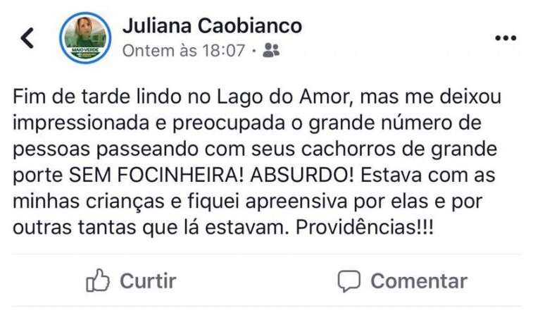 No último domingo (20), a defensora pública Juliana Caobianco postou: “Fim de tarde lindo no Lago do Amor, mas me deixou impressionada e preocupada o grande número de pessoas passeando com seus cachorros de grande porte sem focinheira! Absurdo! Estava com as minhas crianças e fiquei apreensiva por elas e por outras tantas que lá estavam. Providências.”, pediu.