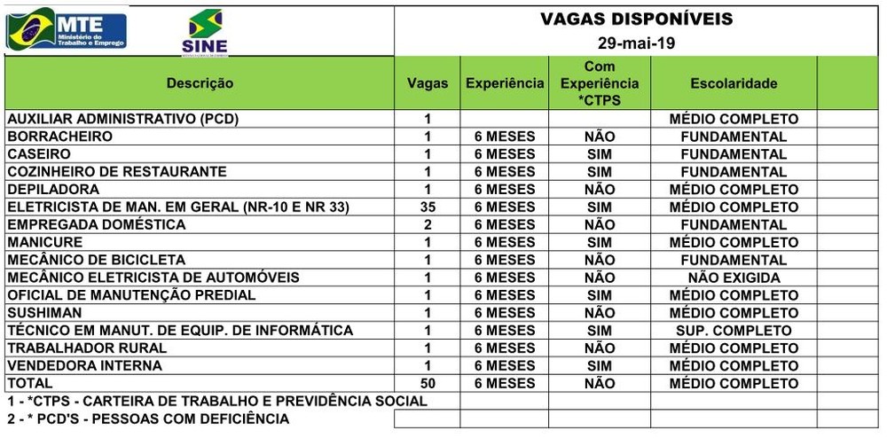 O Sistema Nacional de Emprego do Acre (Sine) disponibiliza 50 vagas para diversas áreas nesta quarta-feira (29) na capital acreana. Os candidatos interessados devem ir até a instituição, que fica na Avenida Getúlio Vargas, n°1.670, em Rio Branco.