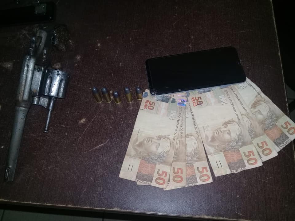 Arma, dinheiro e objecelular apreendidos/Foto: divulgação PMAC