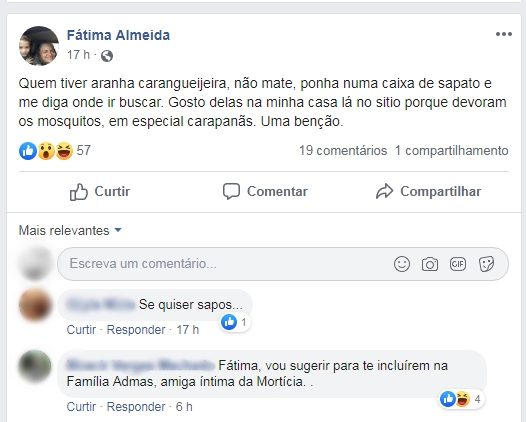 A historiadora acreana e membro da Academia Acreana de Letras (AAL), Fátima Almeida, fez um pedido um tanto inusitado em seu perfil no Facebook. A professora sugeriu aos acreanos que mandassem as caranguejeiras que surgissem nas casas para a sua, considerando o bicho “uma benção”.