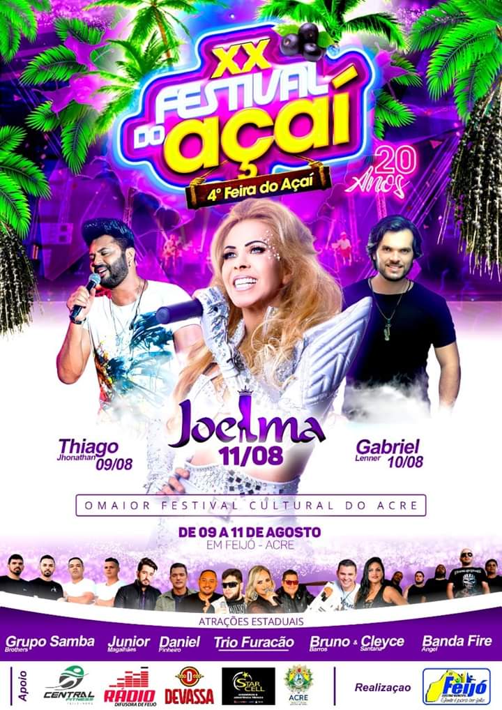 Música, atividades esportivas, gastronomia e concurso de beleza fazem parte da programação de 20 anos do Festival do Açaí, no município de Feijó que ocorre, junto com a 4ª Feira do Açaí, no período de 9 a 11 de agosto na Rua Contorno Beira Rio, na região central da cidade.