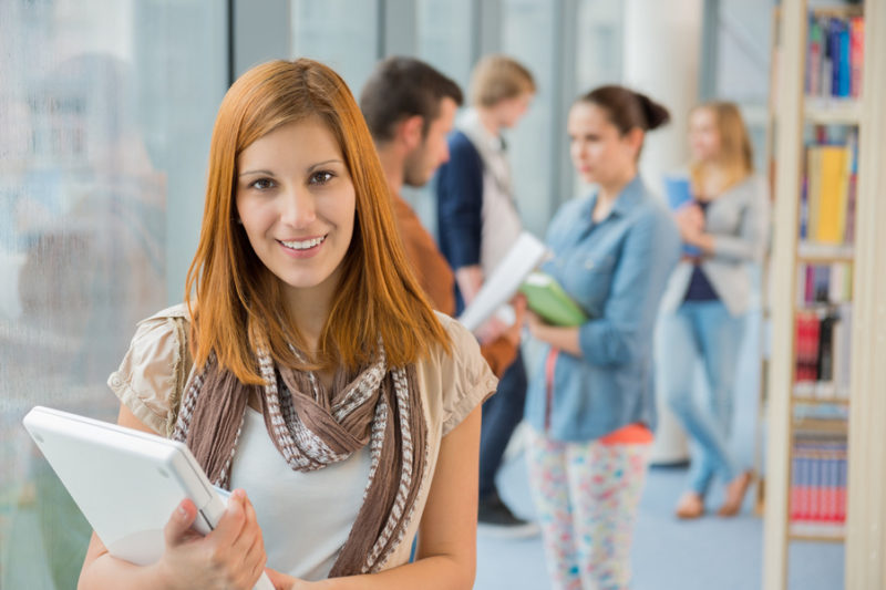 Girl holding laptop with group of students in college library