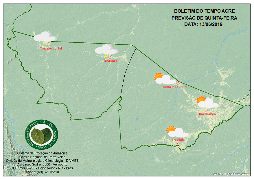 Segundo o Sistema de Proteção da Amazônia (Sipam), a umidade um pouco mais elevada associadas às altas temperaturas formam algumas nuvens deixando o tempo variando de parcialmente nublado a nublado no centro-oeste acreano. Essa instabilidade poderá causar pancadas de chuvas isoladas seguidas de trovoadas nessa região.
