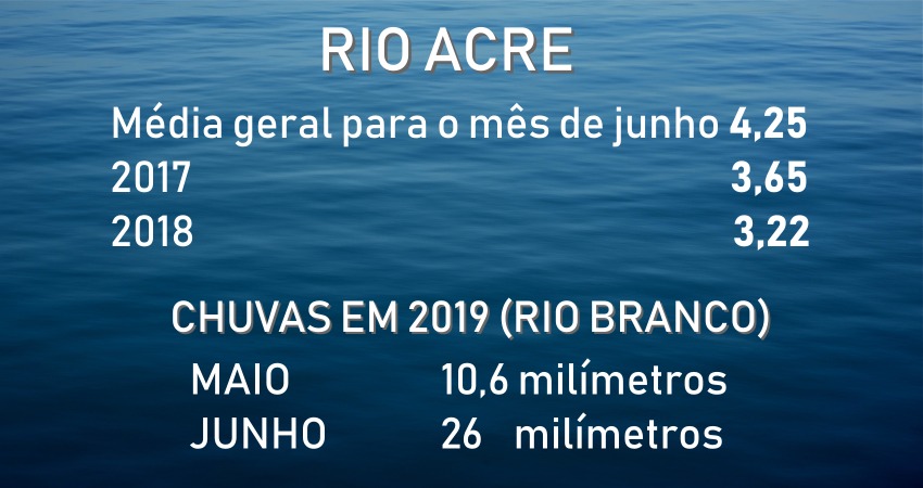 O Rio Acre amanheceu esta segunda-feira (24) medindo 2,04m, número abaixo do esperado para o período. De acordo com o major do Corpo de Bombeiros Cláudio Falcão, a média para o mês de junho é de 4,25m. “O nível do Rio Acre está realmente baixo para esta época do ano, a média do rio, nesta data, em 2017, era 3,65m. E no dia 20 de junho do ano passado, 2018, ele estava com 3,22m”, disse.