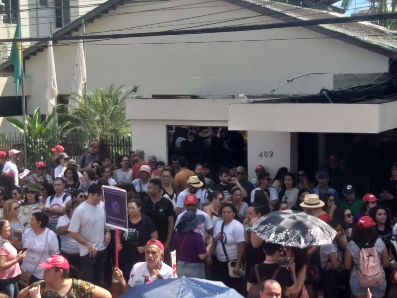 Os servidores da educação e sindicalistas se reúnem em frente a Casa Civil, em Rio Branco, em busca de serem recebidos pelo governador Gladson Cameli (Progressistas).