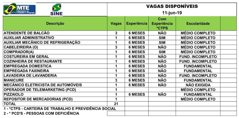 O Sistema Nacional de Emprego do Acre (Sine) disponibiliza 21 vagas para diversas áreas, nesta terça-feira (11), na Capital acreana. Os candidatos interessados devem comparecer pessoalmente à instituição, localizada na Avenida Getúlio Vargas, n°1.670, em Rio Branco.
