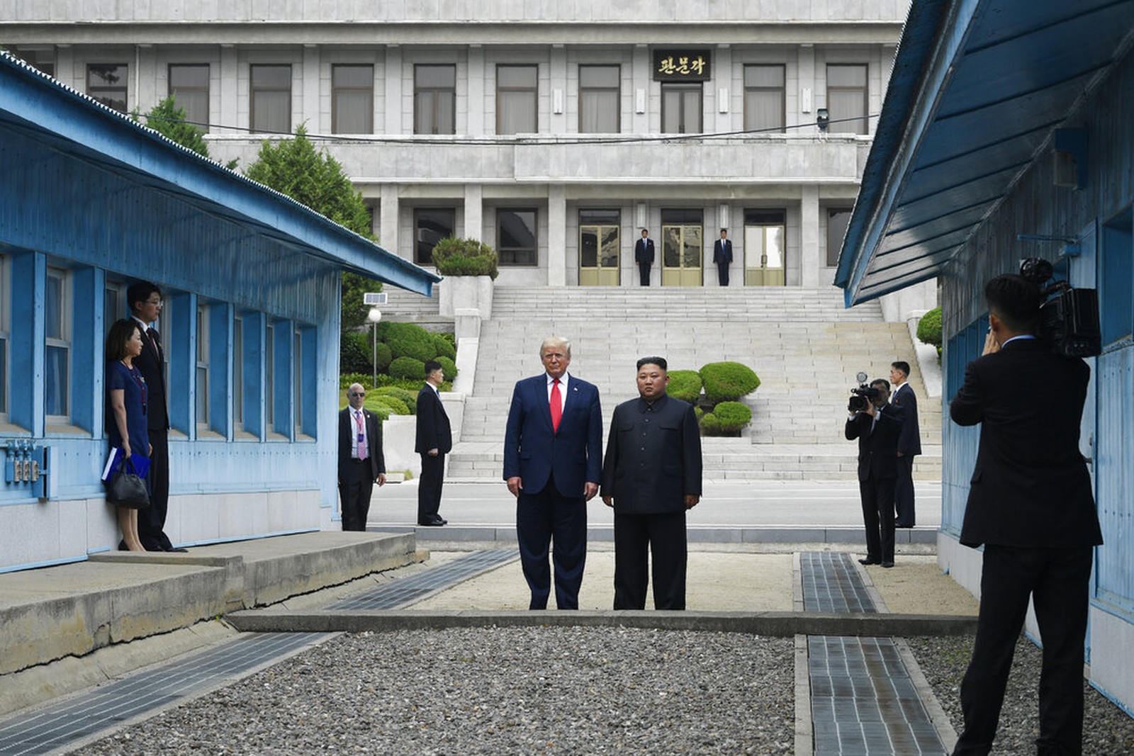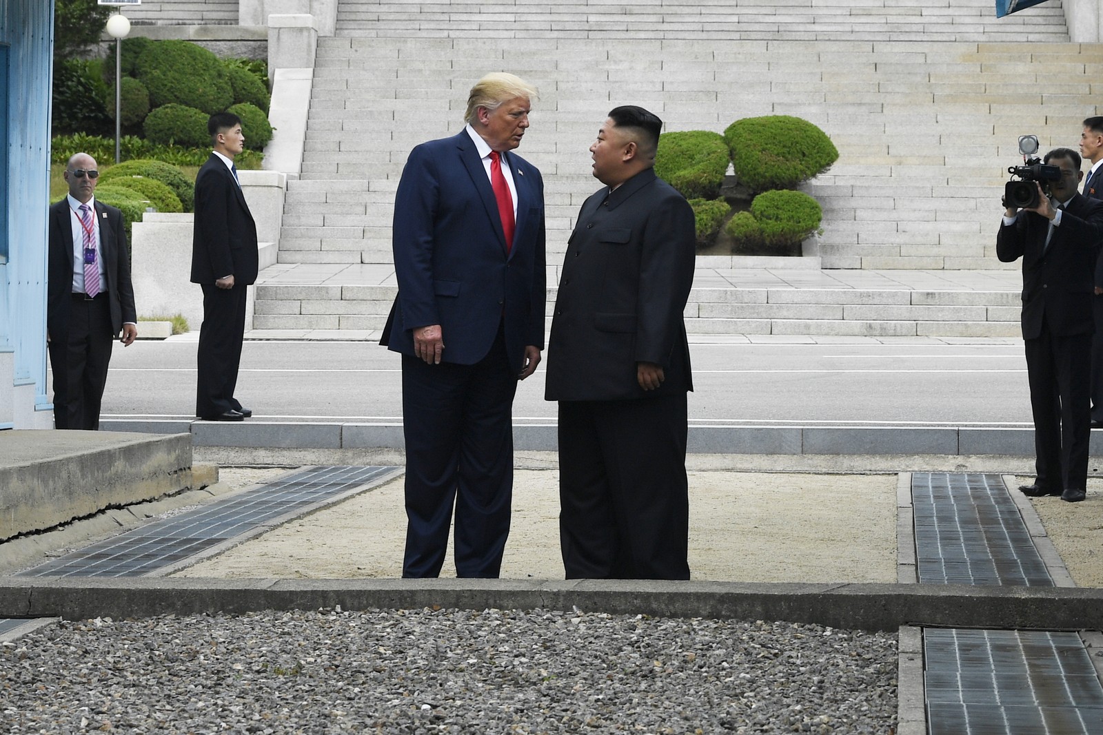 Acompanhado por Kim, Trump deu 20 passos para dentro do território da Coreia do Norte, segundo a CNN. Pouco depois, voltaram ao lado sul, onde se reuniram com o presidente da Coreia do Sul, Moon Jae-in, para uma breve conversa.