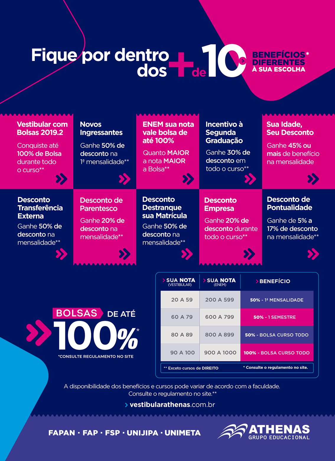 Mas, além delas, ainda estão disponíveis descontos por idade, transferência, reingresso, parentesco e convênio entre empresas. Para conhecer os descontos e saber mais sobre os regulamentos, é só acessar o site: vestibularathenas.com.br