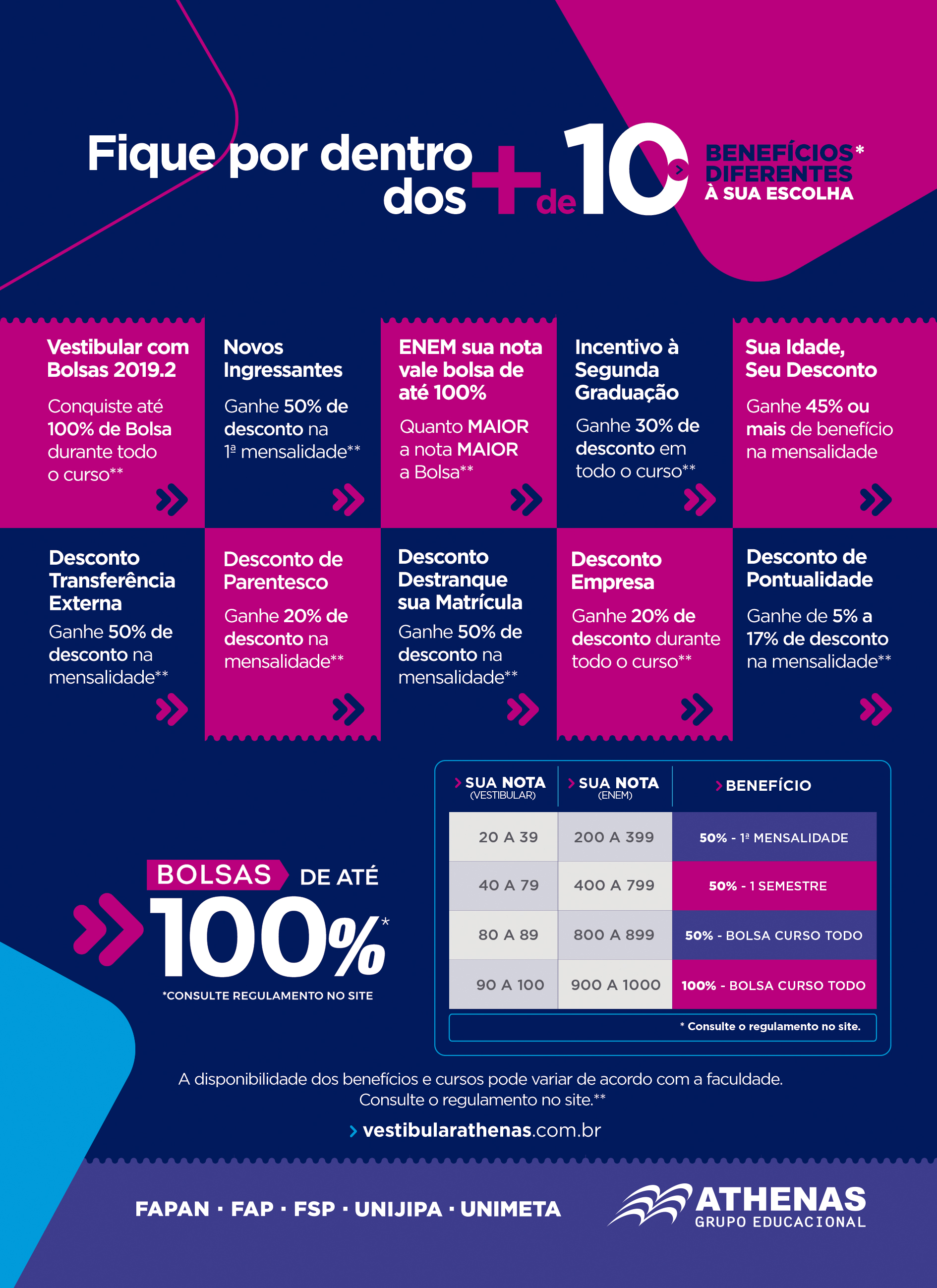 Por isso, quem fizer a prova do Vestibular Agendado 2019.2 na Unimeta e alcançar a partir de 40 pontos, já tem o benefício à disposição. A novidade também alcança os candidatos que já fizeram a prova nesse processo seletivo ou que querem usar a nota da prova de 2019.1 ou do Enem, que neste caso precisa ter a média a partir de 400 pontos. E a melhor parte para os candidatos que querem cursar Direito é que agora eles também podem aproveitar o benefício.