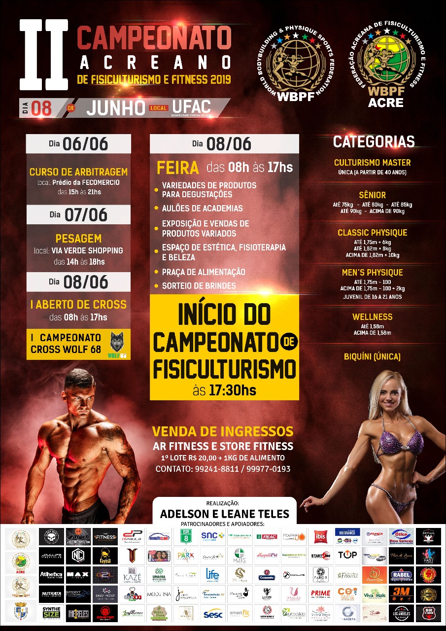 A pesagem serve para definir a categoria de cada competidor. Ao todo são seis categorias: Culturismo Master (para atletas acima de 40 anos), Sênior, Classic Physique, Men’s Physique, Wellness e Biquíni. A competição, promovida pela Federação Acreana de Fisiculturismo e Fitness (WBPF/AC), será dia 8, na Universidade Federal do Acre (UFAC).