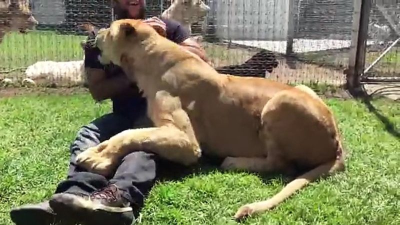 Quando o leão percebeu que os humanos que se aproximavam dele eram seus antigos donos, surpreendeu a todos com sua reação alegre. O leão abraçou seus donos como fazia quando era um filhote, com uma única diferença, ele tinha dobrado de tamanho.