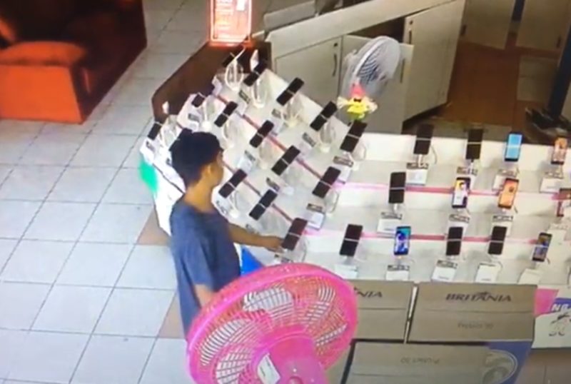 As cenas foram flagradas pelas câmeras de segurança do local, que registraram o momemto exato em que um homem desconecta os celulares dos cabos de segurança e uma mulher tenta disfarçar a ação retirando um ventilador próximo ao local.