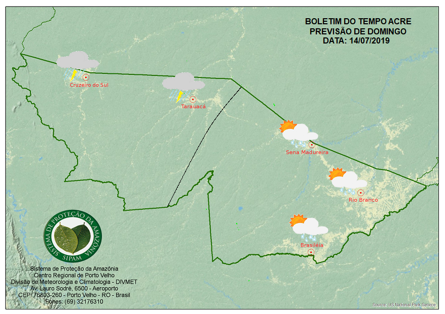 No Acre, o domingo (14) deve ter céu nublado nas cidades do Vale do Juruá, com sol entre muitas nuvens e pancadas de chuva com trovoadas devem ocorrer a partir da tarde.