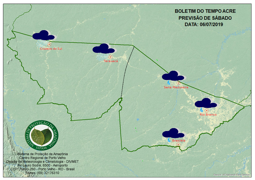 O sábado (6) será de predomínio de temperaturas bem amenas em todo estado, com tempo bastante fechado e com chuva, a qualquer hora do dia, na região do Vale do Juruá, segundo o Sistema de Proteção da Amazônia (Sipam). Nas demais regiões do estado, inclusive na Capital, a previsão é de um dia de céu encoberto a nublado, com pouco sol e possibilidade de chuva ocasionais a qualquer hora do dia.