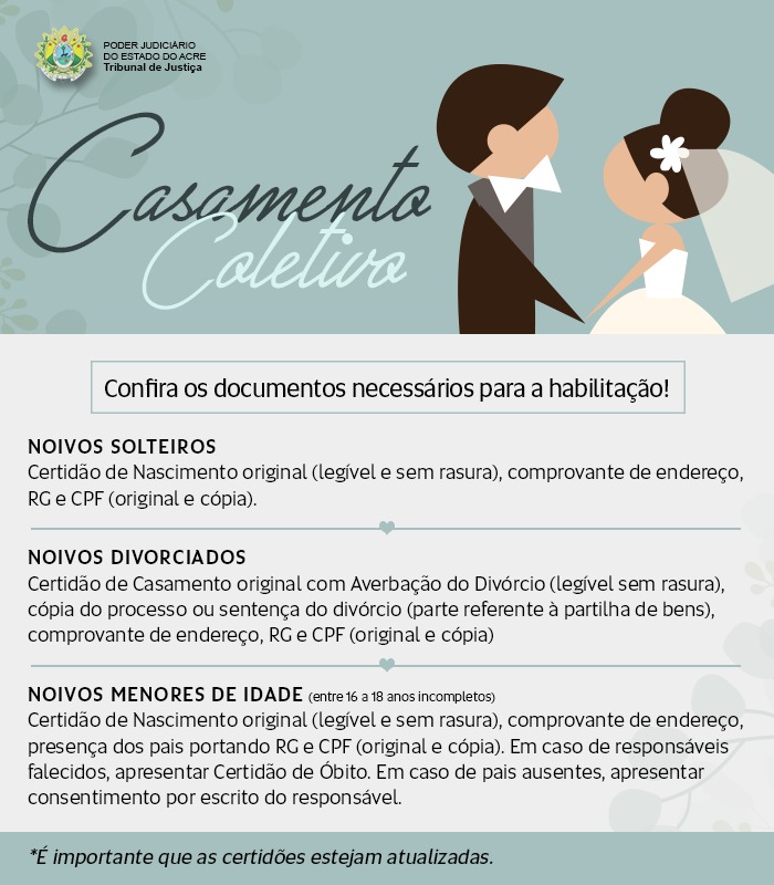 O Tribunal de Justiça do Estado do Acre (TJAC), através do Projeto Cidadão, realizará no dia 2 de agosto, às 16h, na Escola Jader Saraiva Machado, na Vila do V, mais uma edição do Casamento Coletivo.