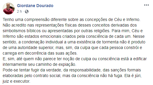 O juiz acreano Giordane Dourado e o pastor Agostinho Gonçalves, da Igreja Batista do Bosque, duas pessoas bastante conhecidas no estado, divergiram, por meio das redes sociais, sobre a existência ou não do céu e o inferno.