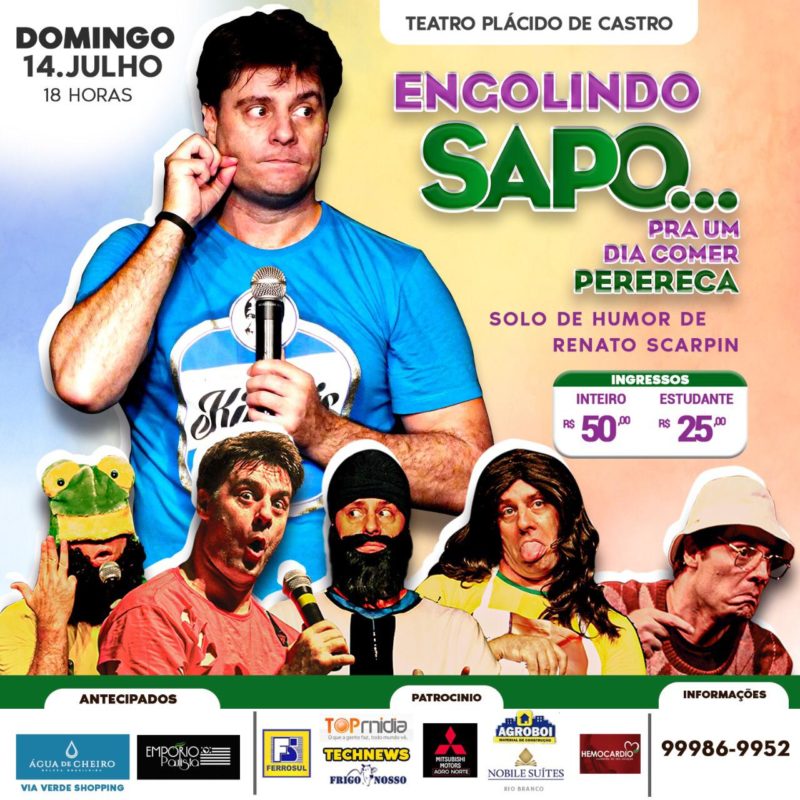 Esse é o nome da peça do humorista, Renato Scarpin que acontece dia 14 deste mês no Teatro Plácido de Castro. Corra para adquirir seu ingresso e garantir boas risadas.