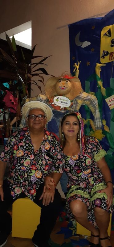Essa colunista prestigiando o arraial ao lado do meu esposo, Denis Alencar e a anfitriã, Kakau Souza