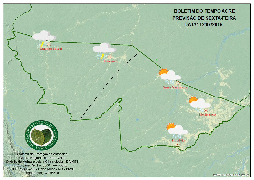 No Oeste do estado esta sexta-feira (12) será de céu parcialmente nublado a nublado, com pancadas de chuva e trovoadas à tarde. Nas demais regiões acreanas o dia será de céu claro a parcialmente nublado, com possibilidade de chuva passageira à tarde e/ou noite.