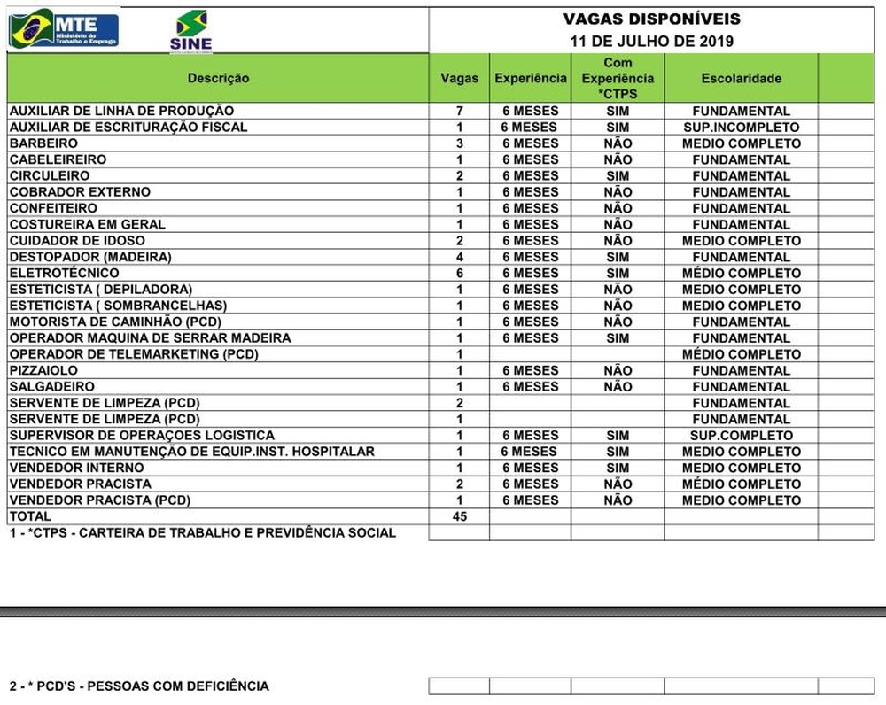 O Sistema Nacional de Emprego do Acre (Sine) disponibiliza 43 vagas para diversas áreas, nesta quinta-feira (11), na Capital acreana. Os candidatos interessados devem comparecer pessoalmente à instituição, localizada na Avenida Getúlio Vargas, n°1.670, em Rio Branco.