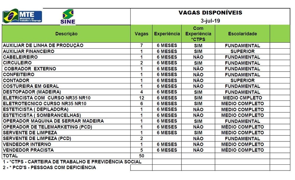 O Sistema Nacional de Emprego do Acre (Sine) disponibiliza 50 vagas para diversas áreas, nesta quarta-feira (3), na Capital acreana. Os candidatos interessados devem comparecer pessoalmente à instituição, localizada na Avenida Getúlio Vargas, n°1.670, em Rio Branco.