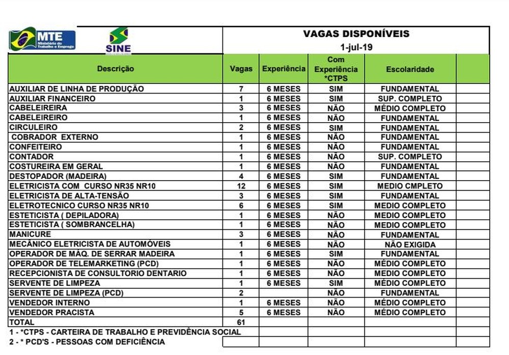 O Sistema Nacional de Emprego do Acre (Sine) disponibiliza 61 vagas para diversas áreas, nesta segunda-feira (1), na Capital acreana. Os candidatos interessados devem comparecer pessoalmente à instituição, localizada na Avenida Getúlio Vargas, n°1.670, em Rio Branco.