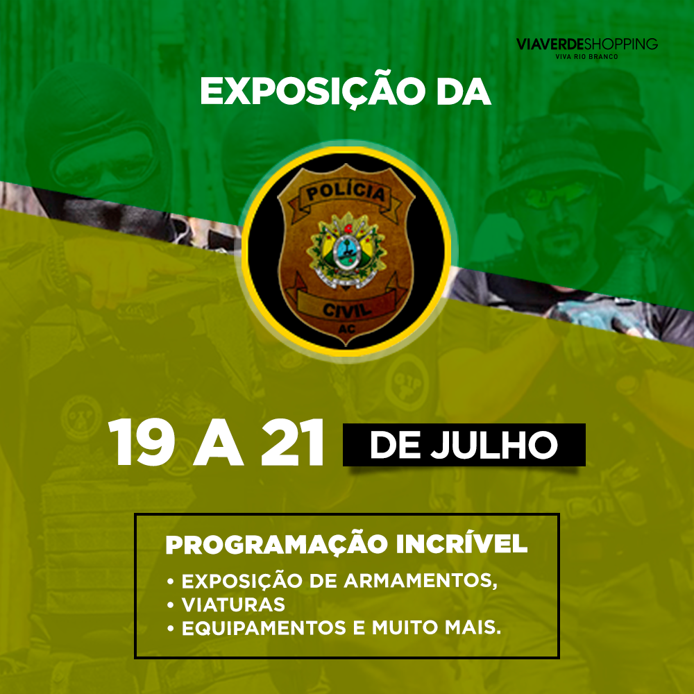 O Via Verde Shopping receberá, entre os dias 19 e 21 de julho, exposição da Polícia Civil do Estado do Acre, a ser realizada no corredor A (em frente à loja Sniper).