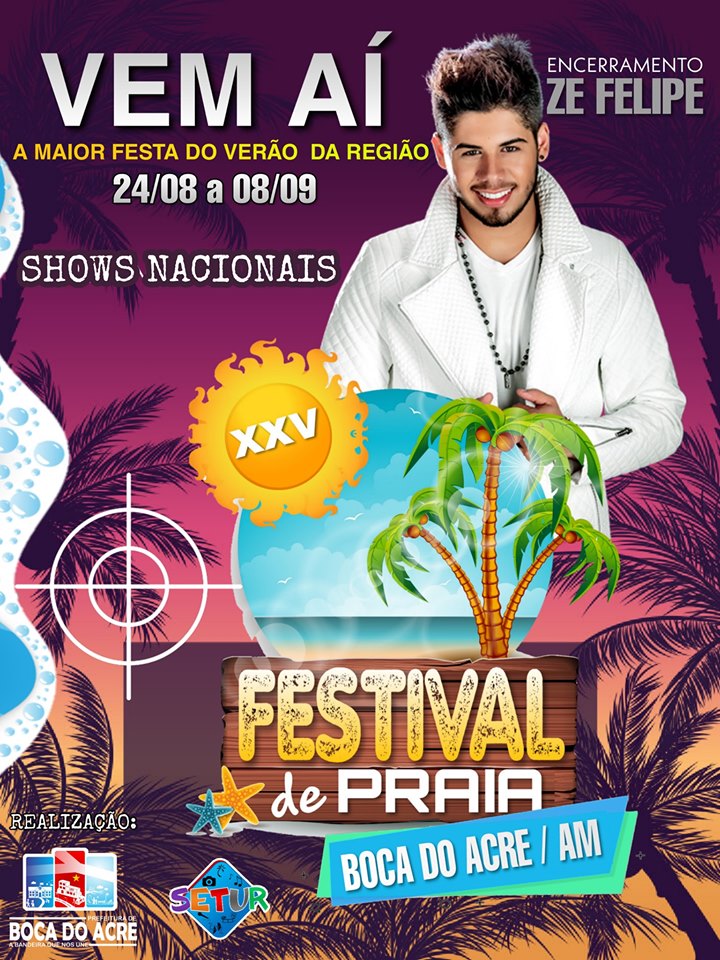 O cantor sertanejo Zé Felipe foi confirmado como atração de encerramento da 25ª edição do Festival de Praia em Boca do Acre, sul do Amazonas. O evento se inicia dia 24 de agosto e encerra no dia 8 de setembro com o show do cantor. Além da atração nacional, também estão confirmadas atrações locais e regionais no palco na tradicional ‘Praia do Gado’.
