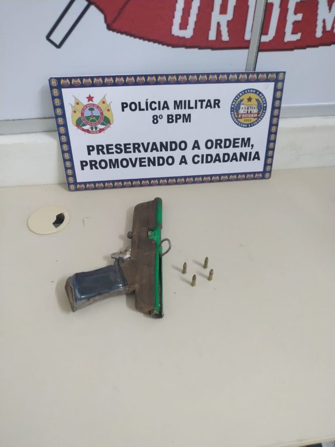 Após os procedimentos de busca foram encontradas 04 munições intactas, cal. 22, 01 arma de fogo de fabricação caseira, cal. 22, e foi recuperada a motocicleta que havia sido roubada.