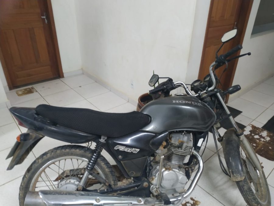 Após os procedimentos de busca foram encontradas 04 munições intactas, cal. 22, 01 arma de fogo de fabricação caseira, cal. 22, e foi recuperada a motocicleta que havia sido roubada.