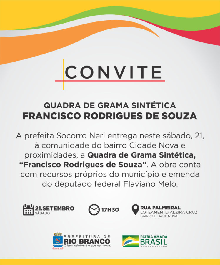 A Prefeitura de Rio Branco, por meio da Fundação de Cultura, Esporte e Lazer Garibaldi Brasil (FGB), inaugura neste sábado, 21, a quadra de grama sintética Francisco Rodrigues de Souza, na Rua Palmeiral, loteamento Alzira Cruz, no bairro Cidade Nova. A solenidade de entrega será às 17h30 e contará com a presença da prefeita Socorro Neri.